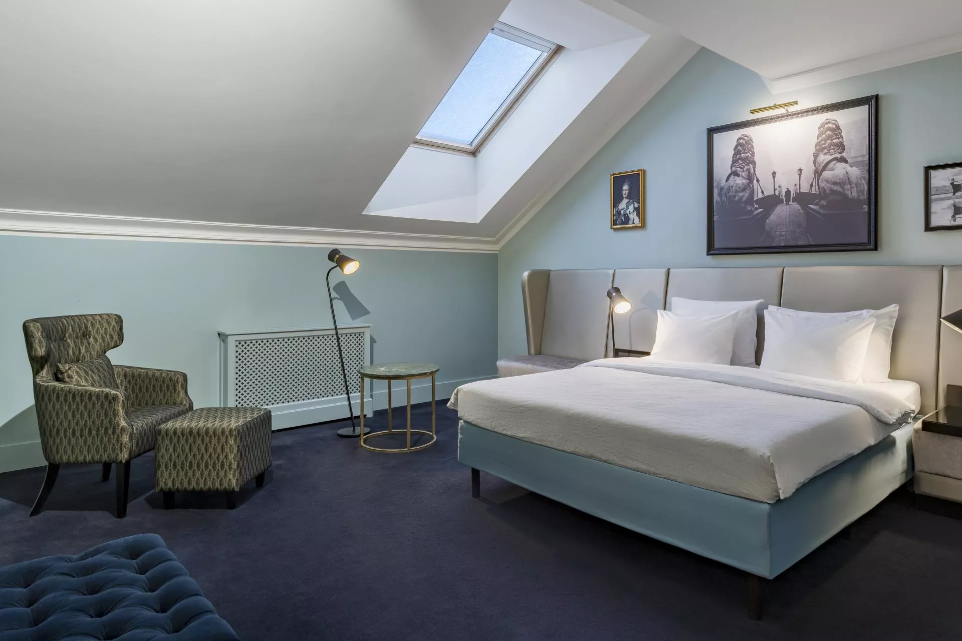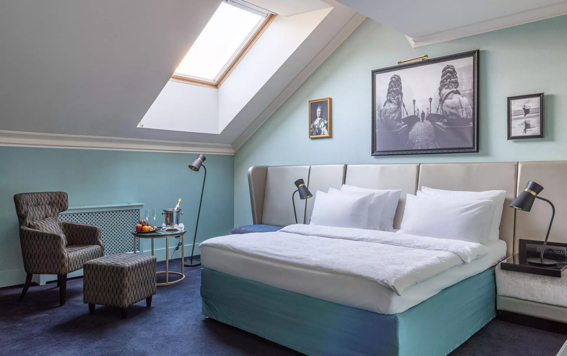 Специально для уникального совместного проекта Cosmos Hotel Group и ФК Зенит был выбран номер категории «Полулюкс» на 5 этаже исторического флагманского отеля сети Cosmos с панорамным видом на Владимирский проспект. Общая площадь номера — 35 кв. метров.