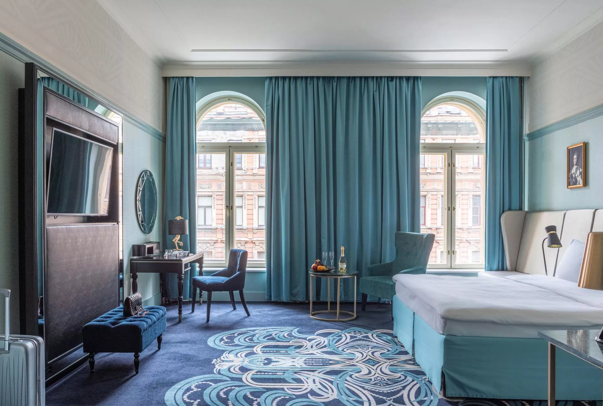Специально для уникального совместного проекта Cosmos Hotel Group и ФК Зенит был выбран номер категории «Полулюкс» на 5 этаже исторического флагманского отеля сети Cosmos с панорамным видом на Владимирский проспект. Общая площадь номера — 35 кв. метров.